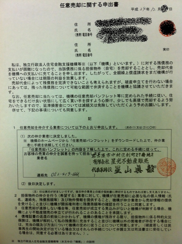 先日、連帯保証人様から任意売却の同意を頂くことができました。
