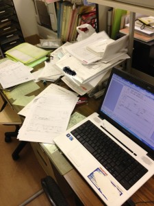 机が書類に覆われてしまっています。