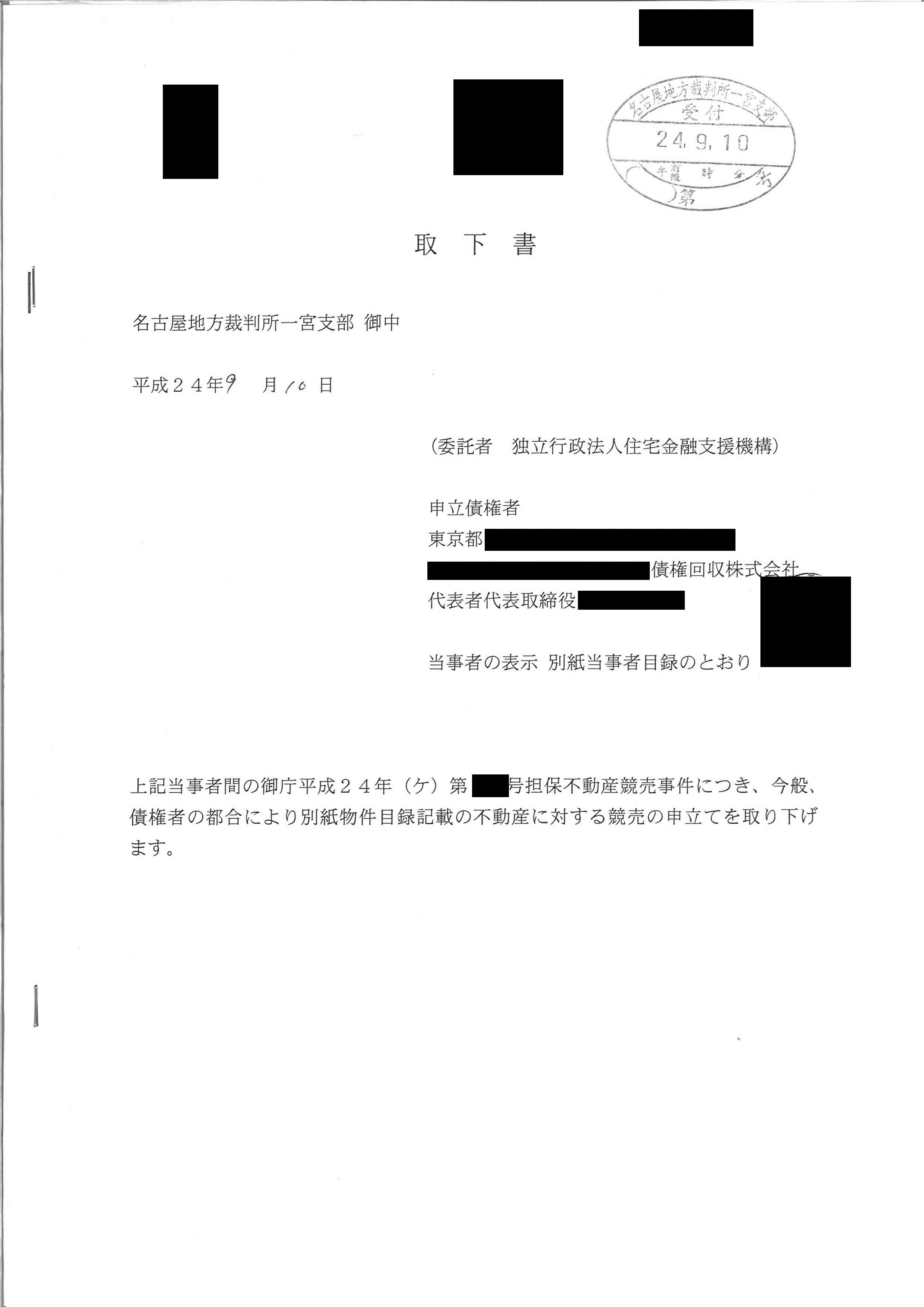 先日の任意売却による決済で、競売の取下げをしてきました。